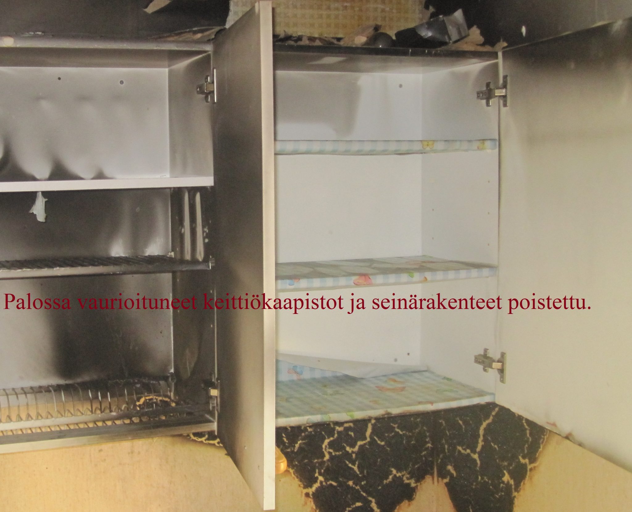 Purettu keittiön kaapistot sekä katon kattolevytystä, kosteuskartoitettu lattiarakenteita palokohteen läheisyydestä.