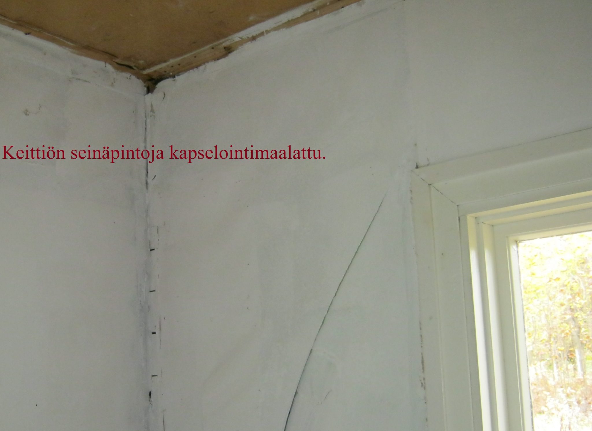 Lopuksi katto- ja seinäpintojen kapselointimaalaustat tarvittavin osin, omistja halusi, että myös nokivaurioituneet tapettiseinäpinnat kapseloidaan.