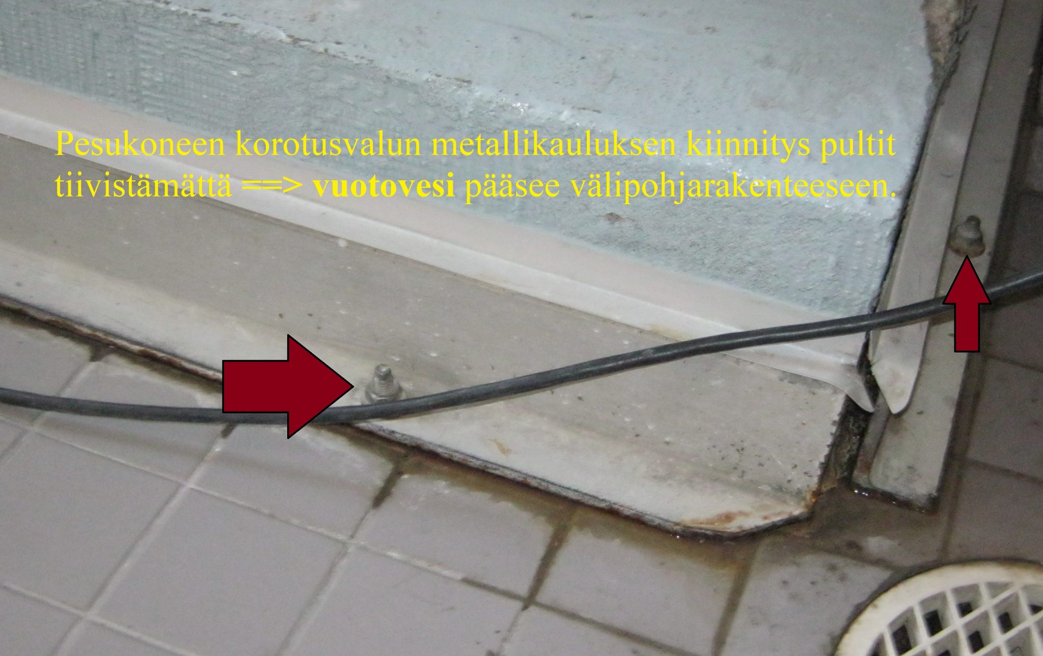 Pesutuvan lattialle putkitulppauksen liitoksesta vuotava vesi, pääsee lattian vedeneristeessä olevien reikien kautta välipohjarakenteeseen