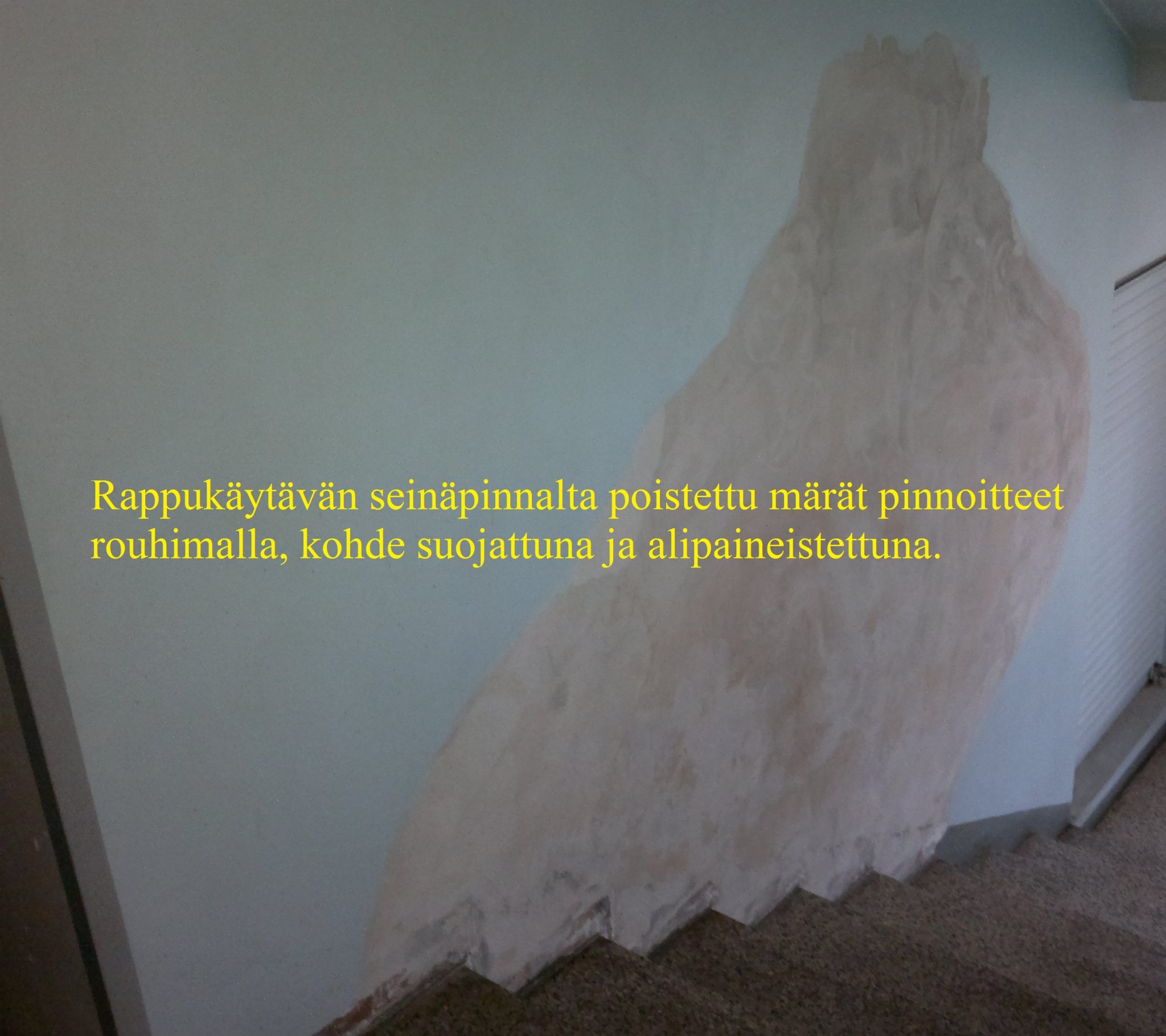 Rappukäytävän seinässä havaittiin ympäristöään korkeampia / huomattavasti korkeampia pintakosteusarvoja n. 1,5 neliön alalla.