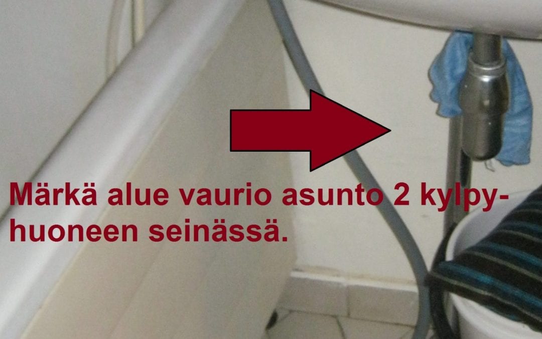 Kerrostalon erään rapun putkihormissa lämpimän käyttövesiputken vuoto. Vuotokohta putkihormin vieressä, lattiavalussa huoneiston 2 wc:ssä. Vaurio huoneiston 1 wc:n katon maalipinnassa, putkihormin vieressä oli vesipusseja, niistä valui vettä. Tämän huone