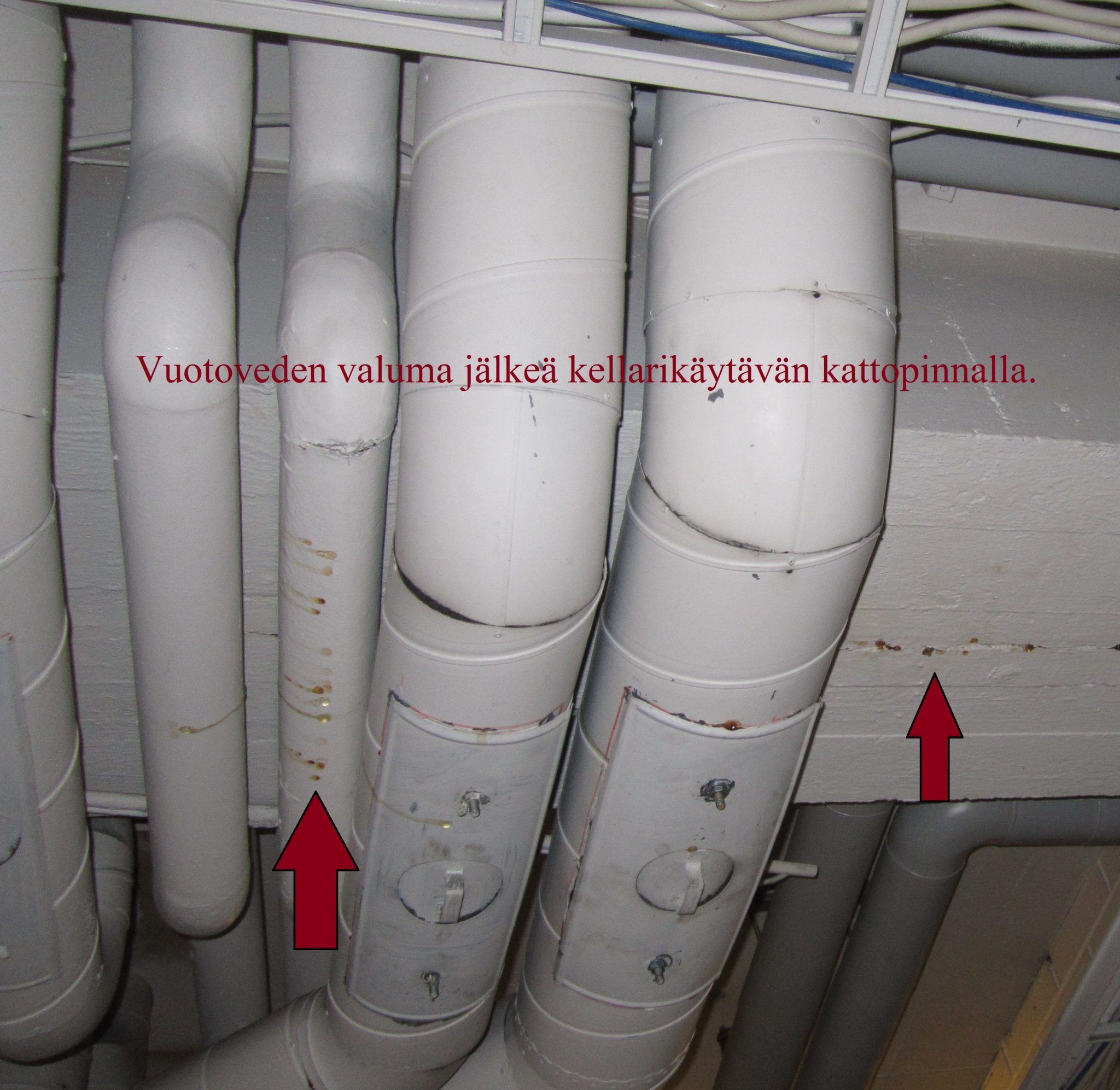 Kellari- / säilytystiloissa tippui vettä vaakapalkin halkeama saumasta noin 2 m:n pituudelta kellarin käytävälle ja lämmönjakohuoneen lattialle.